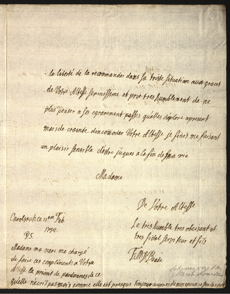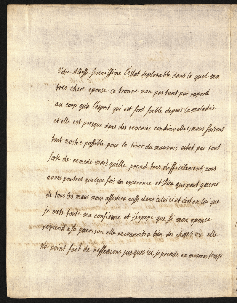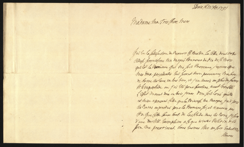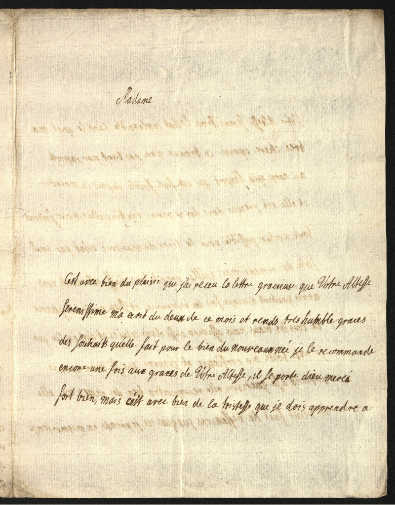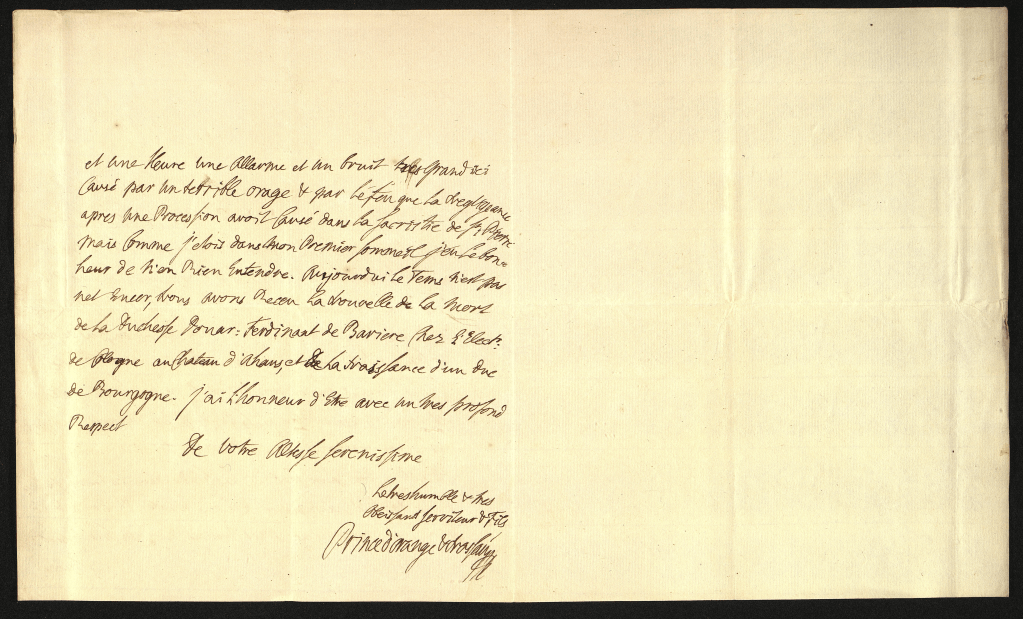 J’ai eu la satisfaction de recevoir ce matin la lettre dont votre Altesse Sérénissime m’a daigné honnerer du fin de le mois qui est la première qui me soit parvenue. J’espère que mes deux précédentes lui seront bien parvenues. Ma cure de boire les eaux va tres bien, et j’en aurois en plus de succès si l’inquiétude où j’ai été pour Caroline n’eut troublé l’effet durant deux ou trois jours, Dieu soit loué qu’elle et mieu à présent, celon que la Princesse me marque.Jj’ai pris les bains aujourd’ui pour la première foi, et n’aurois pas cru que cela cause tant de lassitude dans les bras. Je suis d’une docilitéexemplaire à ce que Winter, Pelerin & le soin me prescrivent. Nous eusmes hier au soir entré onze heures et une heure une allarme et un bruit très grand ici, causé par un terrible orage & par le feu que la négligeance après une procession avoit causé dans la sacristtie de St. Pièrre. Mais comme j’étois dans mon premier sommeil, j’eu le bonheur de n’en rien entendre. Aujourd’ui le tems n’est pas net encor. Nous avons receu la nouvelle de la mort de la duchesse Douar. Ferdinant de Barière chez l’Elect. de Cologne au chateau d’Ahans, et de la naissance d’un duc de Bourgogne. J’ai l’honneur d’être avec un très profond respect