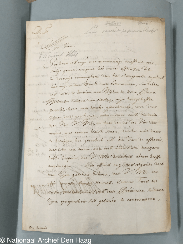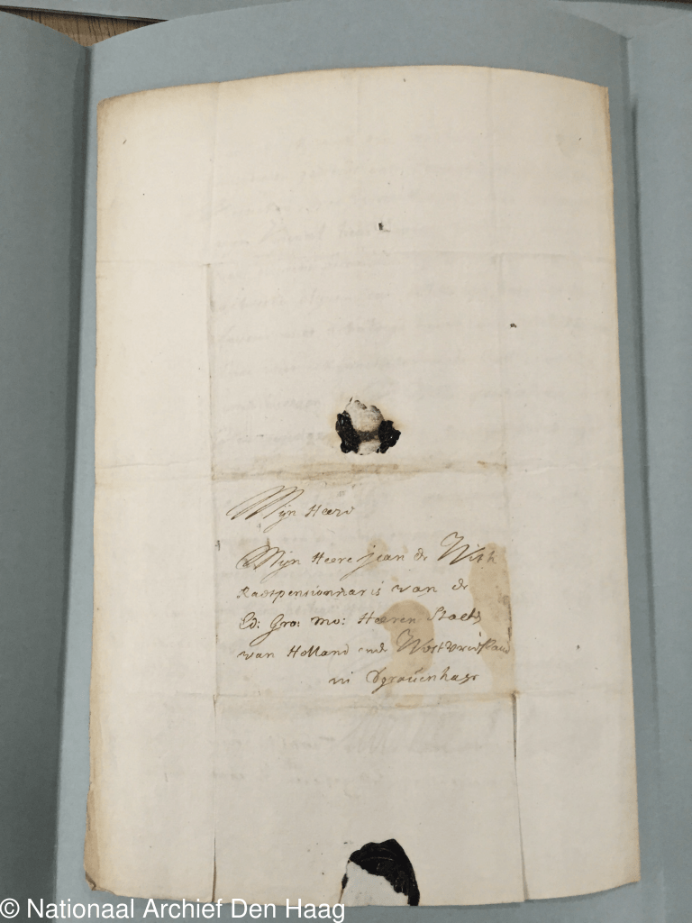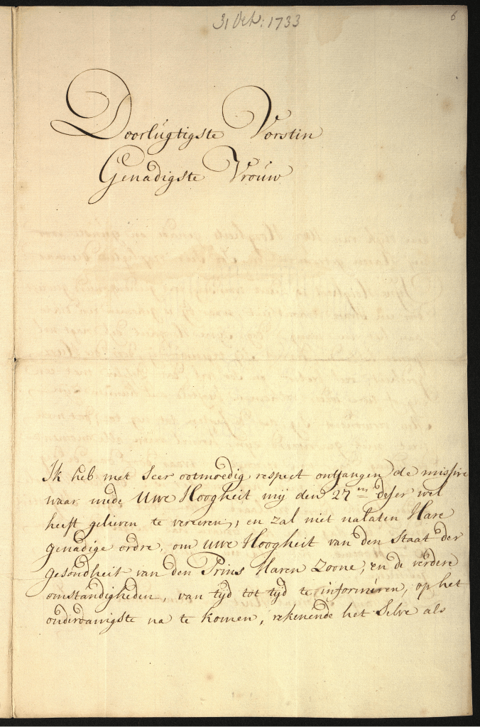 Een andere correspondent was Nicolaas Arnoldi. Hij was eerste secretaris en diende onder Maria Louise en Willem IV. In 1729 werd hij aangesteld als raadsheer, zes jaar later werd hij gedeeltelijk verantwoordelijk voor de thesaurie en vanaf 1739 was hij daarnaast ook nog thesaurier en rentmeester-generaal. Hij was ook zevenmaal burgemeester van Leeuwarden, afgevaardigde voor de Staten van Friesland, gecommitteerde in de Admiraliteit van Amsterdam en nam verder nog zitting in verschillende commissies. (2) Naast zijn verslaggevingen van (inter)nationale politieke gebeurtenissen, hield Arnoldi ook altijd een oogje in het zeil met betrekking tot de gezondheid van Willem. In het volgende fragment stelt Arnoldi Maria Louise op de hoogte van Willem’s welzijn. In een prachtig handschrift schrijft hij onder meer:
