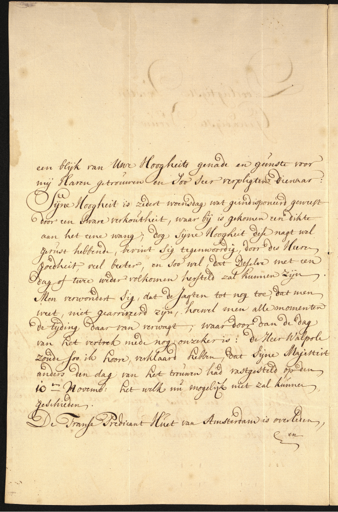 Ik heb met seer ootmoedig respect ontfangen de missive waarmede uwe Hoogheit mij den 27en deser wel heeft gelieven te vereeren; en zal niet nalaten Hare genadige ordre, om Uwe Hoogheit van den staat der gesondheit van den Prins Haren Zoone, en de verdere omstandigheden, van tijd tot tijd te informeren, op het onderdanigste na te komen, rekenende hetselve als een blijk van Uwe Hoogheits genade en gunste voor mij Haren getrouwen en soo seer verpligtens dienaar. Sijne Hoogheit is zedert woensdag wat geïndisponeerd geweest door een sware verkoutheit, waarbij is gekomen een dikte aan het ene wang; dog Sijne Hoogheit dese nagt wel gerust hebbende, bevint sig tegenwoordig, door des Heere goedheit, veel beter en soo wel, dat deselve met een dag of twee weder volkomen hersteld zal kunnen zijn. Men verwondert sig, dat de jagten tot nog toe, dat men weet, niet gearriveerd zijn, hoewel men alle momenten de tijding daar van verwagt; waardoor dan de dag van het vertrek mede nog onzeker is: de Heer Walpole zoude, soo ik hoore, verklaard hebben, dat Sijne Majesteit anders den dag van het trouwen had vastgesteld op den 10en novemb:, hetwelk nu mogelijk niet zal kunnen geschieden.