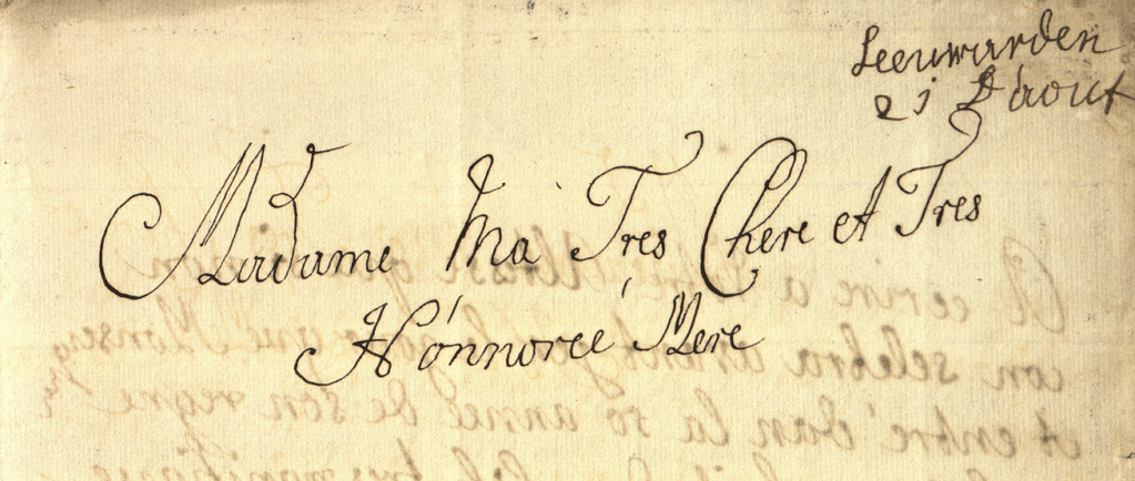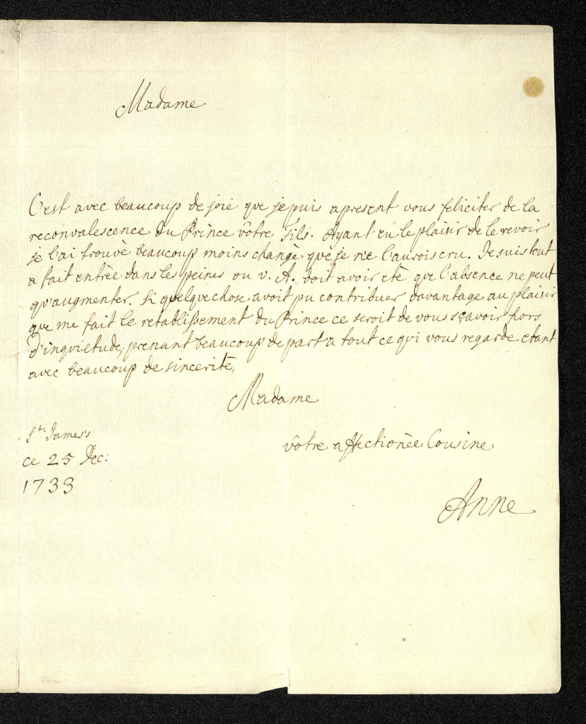Een van deze correspondenten was Anna van Hannover (1709-1759), de echtgenote van Willem IV. Anna was de oudste dochter van de Engelse koning George II. Als Britse prinses was zij een goede huwelijkskandidaat voor Willem IV, aangezien zij hierdoor voor meer aanzien zorgde voor het huis Oranje-Nassau. Het stel trouwde in maart 1734. Eigenlijk stond de huwelijksdag gepland voor het najaar van 1733, maar deze werd uitgesteld omdat de bemoeienissen van Willems toekomstige schoonvader George II met de Republiek niet op prijs werden gesteld. Willem werd, mede vanwege alle ophef, ziek en vertrok naar het kuuroord Bath. In maart van 1734 was hij voldoende hersteld om in het huwelijk te treden. Gedurende zijn tijd in Engeland correspondeerde hij veel met zijn moeder, maar ook Anna schreef Maria Louise wekelijks korte brieven met daarin berichten over hoe het ging. Vaak werd hier ook de gezondheid van de jonge prins beschreven. In de brief hieronder schreef Anna op Eerste Kerstdag in 1733 dat het beter ging met Willem: ‘C’est avec beaucoup de joie que je puis à présent vous féliciter de la réconvalescence du prince votre fils. Ayant eu le plaisir de le revoir, je l’ai trouvé beaucoup moins changé que je ne l’aurois cru’.