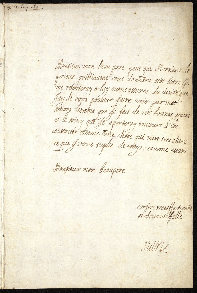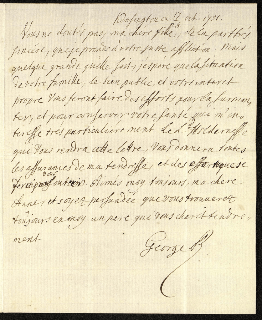 Vous ne doutés pas, ma chère fille, de la part très sincère que je prends à votre juste affliction. Mais quelque grande qu’elle soit, j’espère que la situation de votre famille, le bien public, et votre intérêt propre vous feront faire des efforts pour la surmonter, et pour conserver votre santé qui m’intéresse très particulièrement. Le l. d’Holdernesse, qui vous rendra cette lettre, vous donnera toutes les assurances de ma tendresse, et des efforts que je ferai pour vous soutenir. Aimés-moy toujours, ma chère Anne, et soyez persuadée que vous trouverez toujours en moy un père qui vous chérit tendrement,