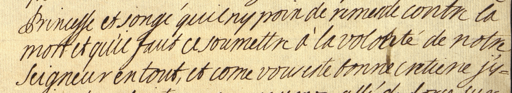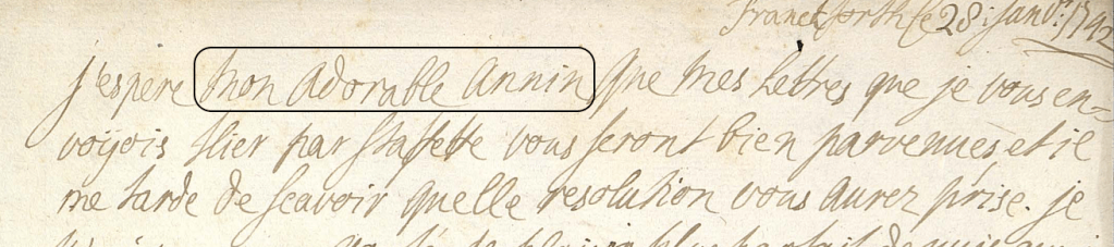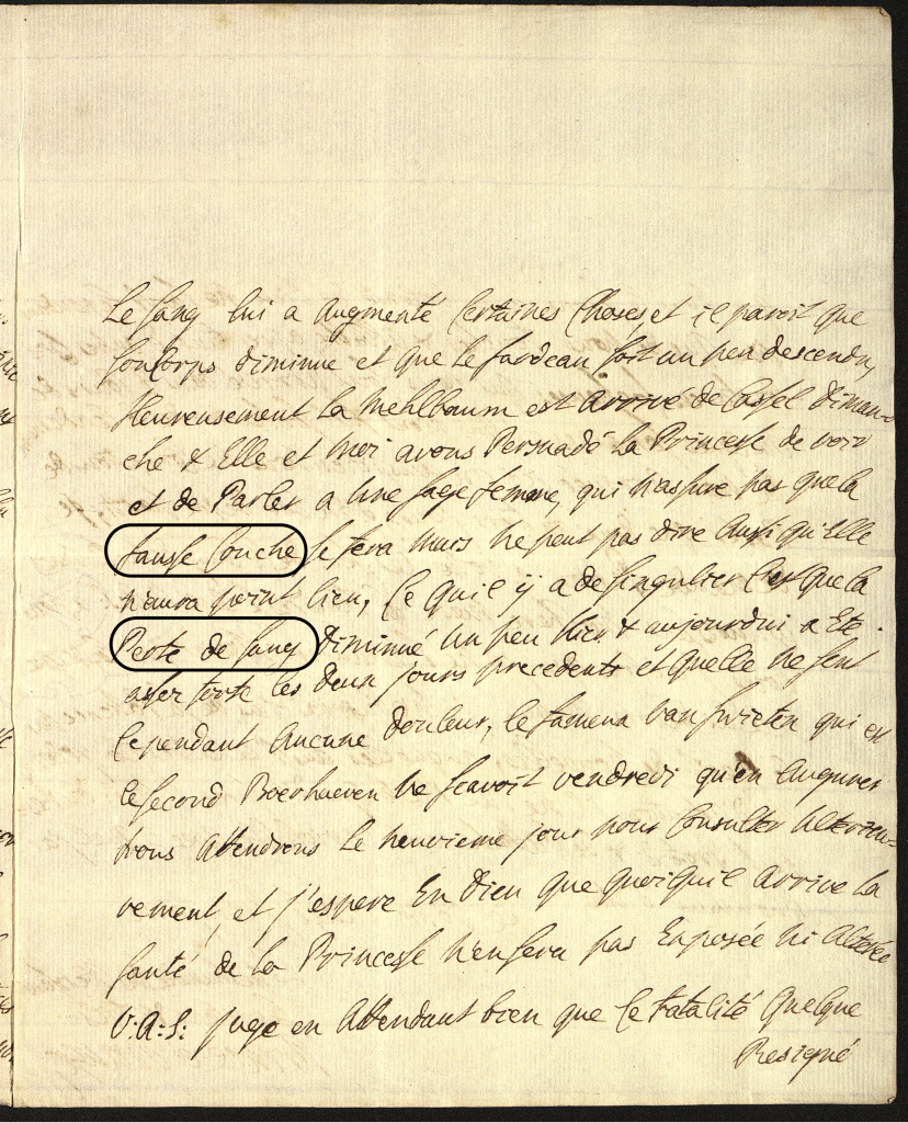 […] Heureusement la Mehlbaum est arrivé de Cassel dimanche & elle et moi avons persuadé la Princesse de voir et de parler à une sagefemme, qui n’assure pas que la fausse couche se fera, mais ne peut pas dire aussi qu’elle n’aura point lieu. Ce qu’il y a de singulier, c’est que la perte de sang diminué un peu hier & aujourd’ui a été assez forte les deux jours précédents, et quelle ne sent cependant aucune douleur. Le fameux Van Swieten, qui es le second Boerhaeven, ne sçavoit vendredi qu’en augurer. Nous attendrons le neuvième jour pour consulter ultérieurement, et j’espère en Dieu que quoiqu’il arrive la santé de la Princesse n’en sera pas exposée ni altérée. […]