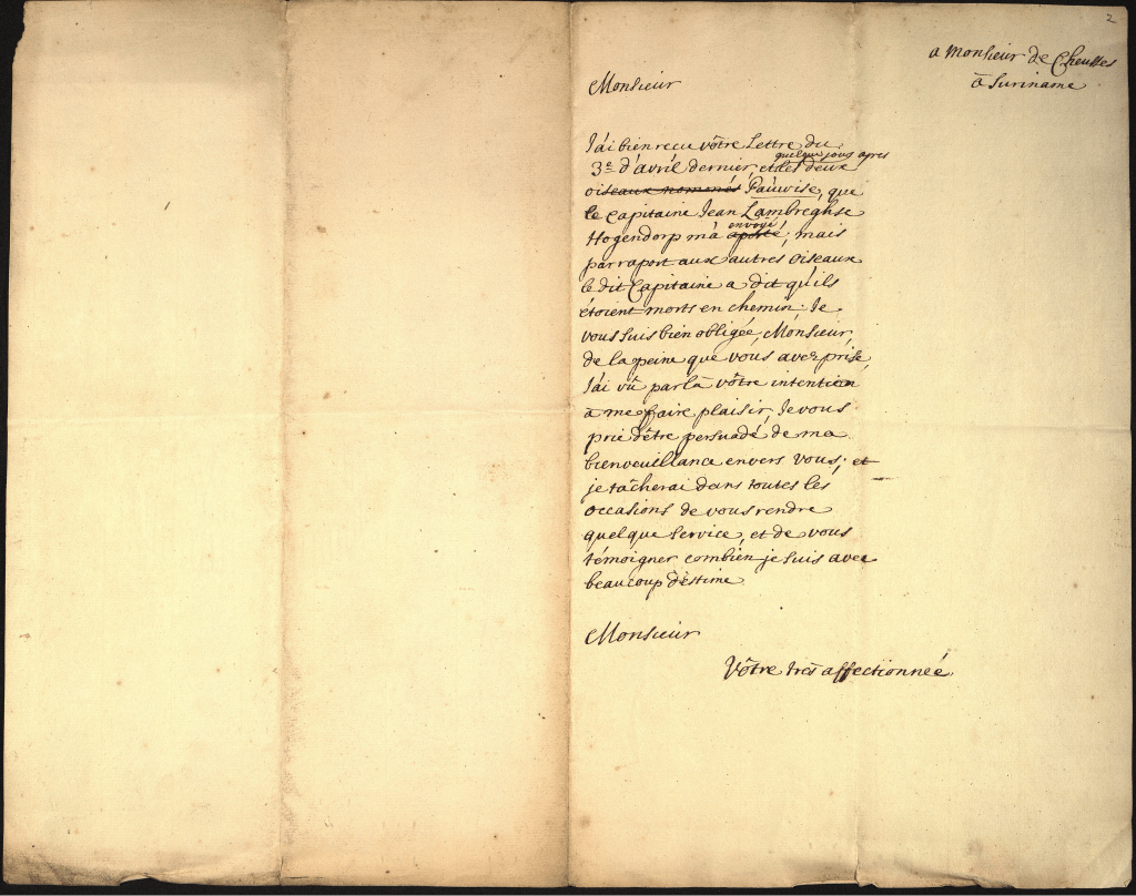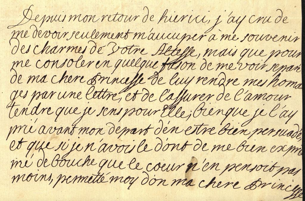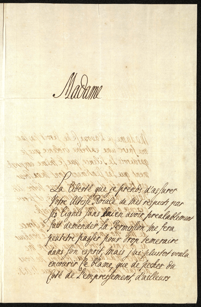 La liberté que je prends d’assurer Votre Altesse Roiale de mes respects par ses lignes sans lui en avoir préalablement fait demender la permission, me fera peut-être passer pour trop téméraire dans son esprit, mais j’ai plutôt voulu encourir ce blâme, que de pêcher du coté l’empressement. D’ailleurs, Madame, je l’avoue ce ne serait pas sans me faire une extrême violence que je garderois le silence, que ce même empressement que les sentiments dont mon cœur est rempli et pénétré pour Votre Alt. Roiale fassent mon apologie, et serve d’excuse à mon trop de hardiesse.