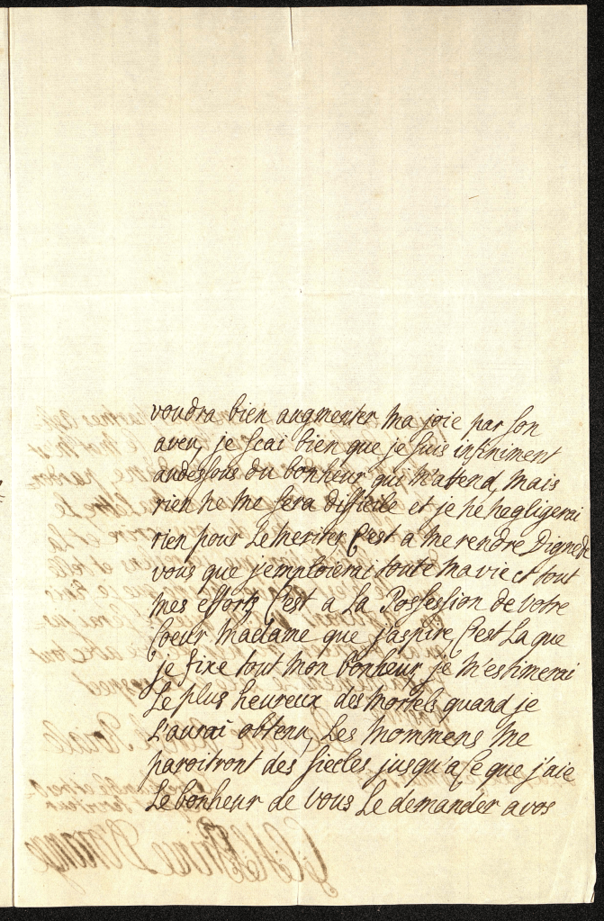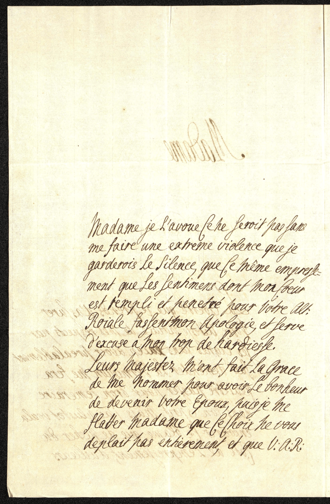 Leurs Majestez m’ont fait la grâce de me nommer pour avoir le bonheur de devenir votre époux, puis je me flatter, Madame, que ce choix ne vous déplaît pas entièrement, et que V.A.R. voudra bien augmenter ma joie par son aveu. Je sçai bien que je suis infiniment au-dessous du bonheur qui m’attend, mais rien ne me sera difficile et je ne négligerai rien pour le mériter, c’est à me rendre digne de vous que j’emploierai tout ma vie et tout mes efforts. C’est à la possession de votre cœur, Madame, que j’aspire, c’est là que je fixe tout mon bonheur, je m’estimerai le plus heureux des mortels quand je l’aurai obtenu. Les mommens me paraîtront des siècles jusqu’à ce que j’aie le bonheur de vous le demander à vos pieds et de vous y témoigner par mes assiduité combien je vous aime. Ce mot m’est échappé, pardonné-le Madame. Pardonné aussi la longueur de ma lettre, le bonheur que j’ai de vous écrire, et la douce satisfaction que j’exressens et telle que ce n’est qu’avec peine que je finis, en assurant V.A.R. que je serai jusqu’au dernier soupir de ma vie avec tout l’attachement le zèle et le respect possible,