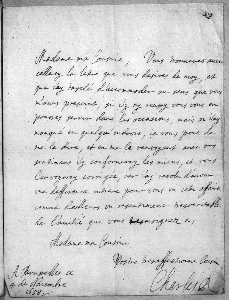 [You may believe that, since Cromwell’s death, my thoughts have been entirely occupied with the changes which may result from it, both in England and beyond […] I would therefore ask you, if you please, to let me know if you are in a position to receive a proposal from me concerning Princess Henriette, your daughter […]. I am well aware that I am not using the usual method in such matters, but you can see from this the esteem in which I hold your daughter and the extent of my confidence in you.]