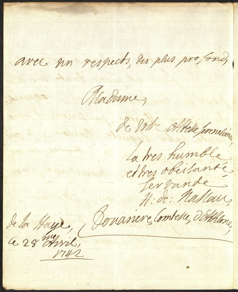 [16] ‘[…]Je n’aurai pas lessée echaper, une si bonne occation De temoigner en qu’elleque maniere a Votre Altesse Serenessime le zelle avec láqu’elle Je suis et serai toute ma vie, Madame, de votre Altesse Serenesime La tres humble et tres obeisante servante H. de: Nassau douariere, Comtesse, d’Athlone’