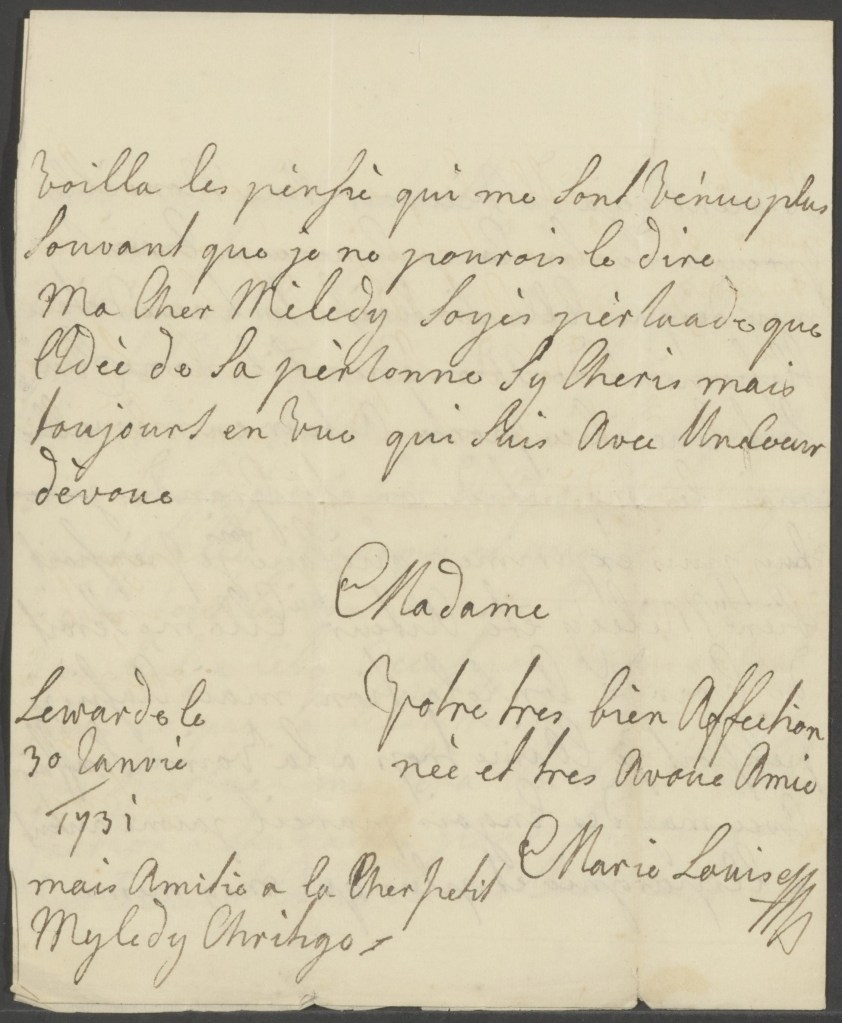 Maria Louise spreekt Henriëtte ook vaak aan met de Engelse aanspreekvorm ‘Milady’, waarschijnlijk omdat zij gravin van het Ierse Athlone was, destijds onderdeel van het Britse Rijk. Ze sluit haar brieven aan Henriëtte meestal af met een zin zoals de volgende, uit een korte brief uit 1739: