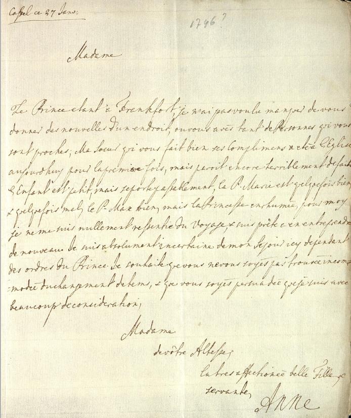 [15] ‘J’ai l’honneur, de rendre mes tres humble remercimens, A Votre Altesse Serenessime pour la tres Grascieusse, lettre, que vous avec eu la bontée Madame, de m’ecrire, (en response de celle que J’avez prissé, la libertée de vous adresser,) par láqu’elle J’ai veuë avec une joies enemprimable, que Votre Altesse Serenissime m’onnore, toujours de sa prescieusse, bienvaillance[…]’ Henriëtte van Nassau-Zuylestein aan Maria Louise van Hessen-Kassel, 20 mei 1735, Koninklijke Verzamelingen, Den Haag, A28-170_002.